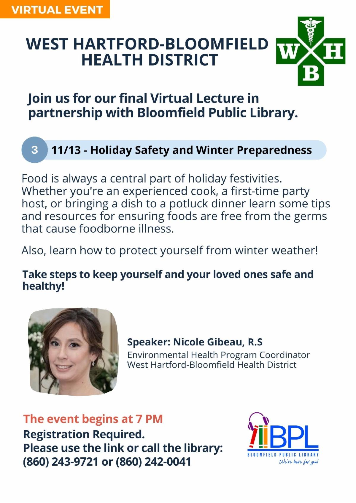 Food is often a central part of holiday festivities. Whether you're an experienced cook, a first-time party host, or making a dish for a potluck dinner, learn some tips and resources for ensuring foods are free from the germs that cause foodborne illness. Also, learn how to protect yourself from winter weather! Take steps to keep yourself and your loved ones safe and healthy. Presented by the West-Hartford-Bloomfield Health District. For Adults. | |