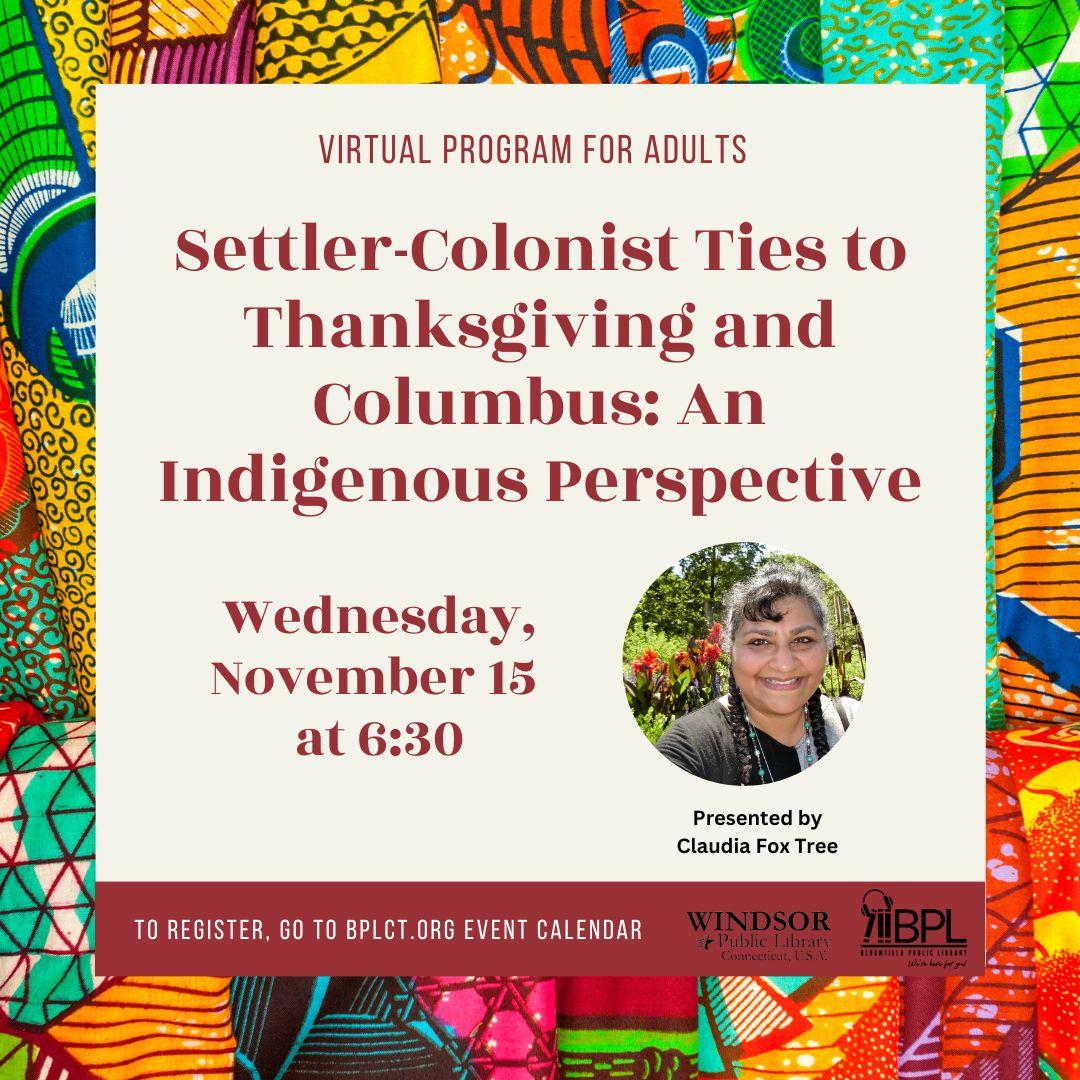 Missing information, inaccurate stories, and stereotypes perpetuate myths about Columbus and Thanksgiving. When we can't describe an accurate First Nations perspective, it's often because we have grown up in a system that has made hard truths invisible. In this presentation, Claudia Fox Tree will explore this colonial system, examine how language perpetuates invisibility, and consider how to dismantle oppression to bring accurate counter-narratives to life. For Adults. | |