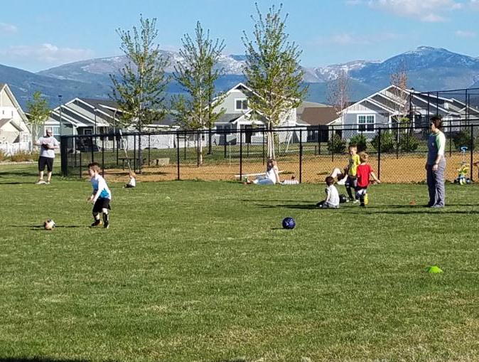 The whole family out having fun with soccer balls and softballs in Mountain View Park.
