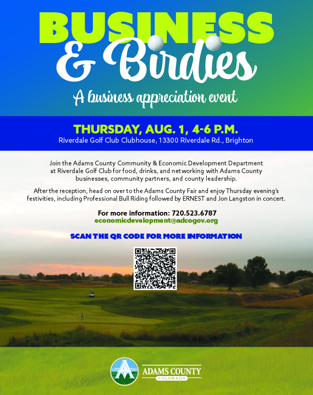 Come join the Commerce City Chamber and Adams County Community & Economic Development Department at the Business & Birdies Business Appreciation Event on Thursday, Aug. 1 from 4-6 p.m. at Riverdale Golf Club. Enjoy foods, drinks and networking with other chambers across the county along with Adams County leadership and community partners. After the reception, head on over to the Adams County Fair and enjoy Thursday evening’s festivities, including Professional Bull Riding followed by ERNEST and Jon Langston in concert. Register here to save your spot!