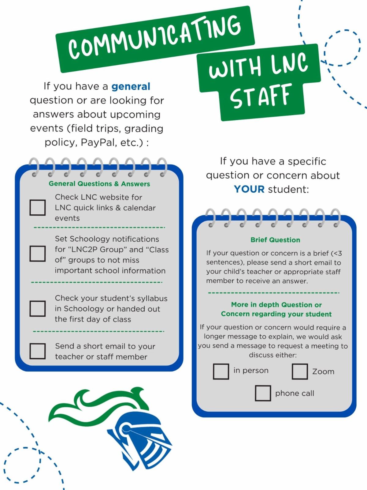 If you are seeking general school or course information, don’t forget to check our website and your Schoology account first as each have a wealth of information. Be sure to select “High School” on our website and check your Schoology groups' (LNC2HSP and Class of) Resource Folders. Finally, by viewing as your student in Schoology, you have access to academic information specific to his/her student’s courses.