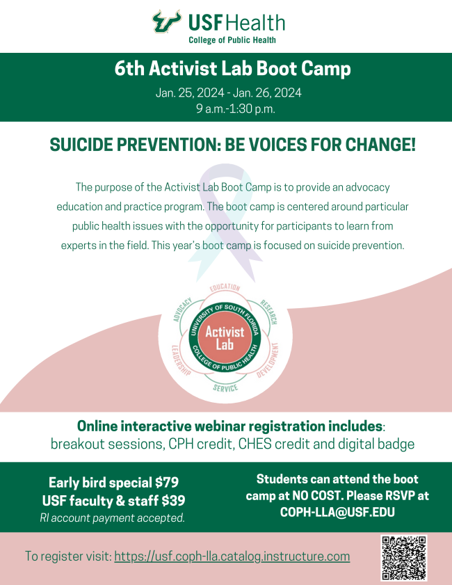 The purpose of the Activist Lab Boot Camp is to provide an advocacy education and practice program. The boot camp is centered around particular public health issues with the opportunity for participants to learn from experts in the field. This year’s boot camp is focused on suicide prevention. Registration is free for students or $39 for USF faculty & and staff.