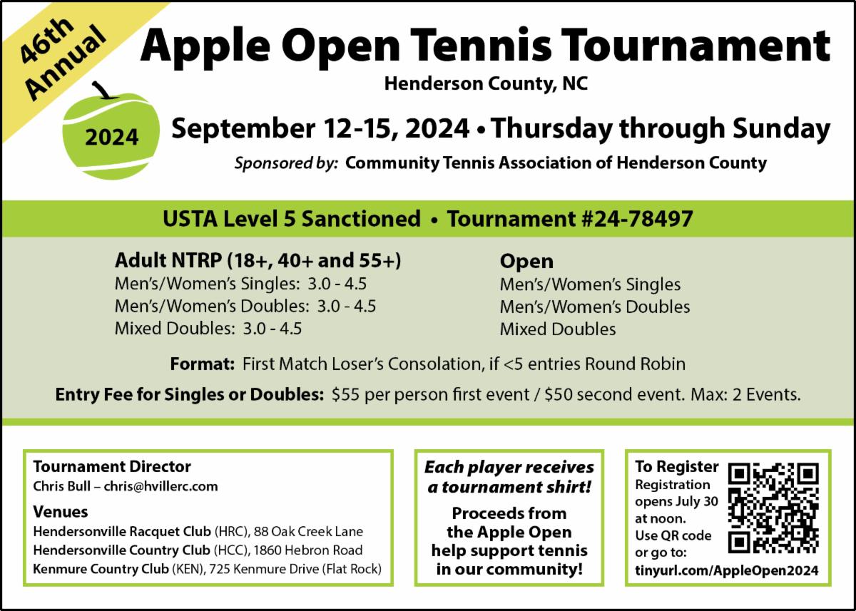 This is the last week to register for our 2024 Apple Open Tennis Tournament. Registration closes on Sunday, September 8 at 11:59 pm. Register now at: TinyURL.com/AppleOpen2024