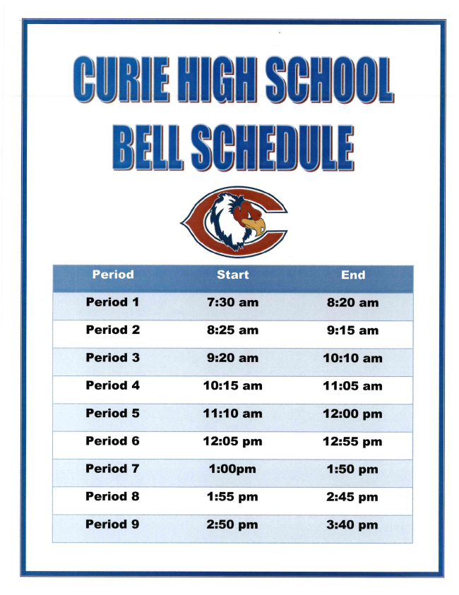 In order to position us to have a smooth transition back to the school building when health conditions allow CPS to make that decision, Curie will continue to use our regular class schedule during distance learning (see below). Students will either have a 1-8 (7:30a-2:45p) or a 2-9 (8:25a-3:40p) schedule. Students will be required to join a Google Meet with their video on for each class period they have daily.