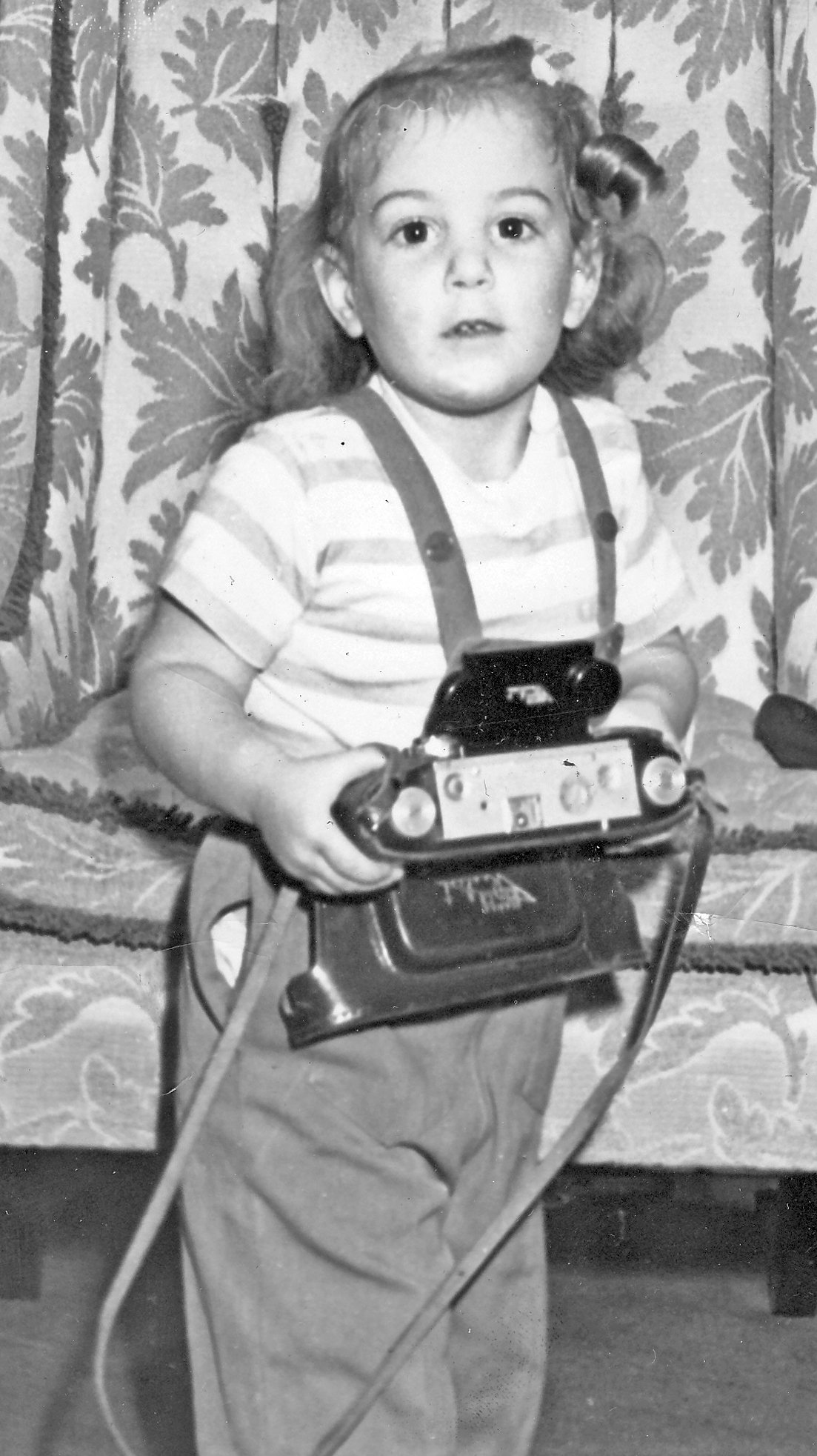 RIGHT: Kathy holding her dad's stereo camera in Detroit in 1953. the dye for a career was cast!