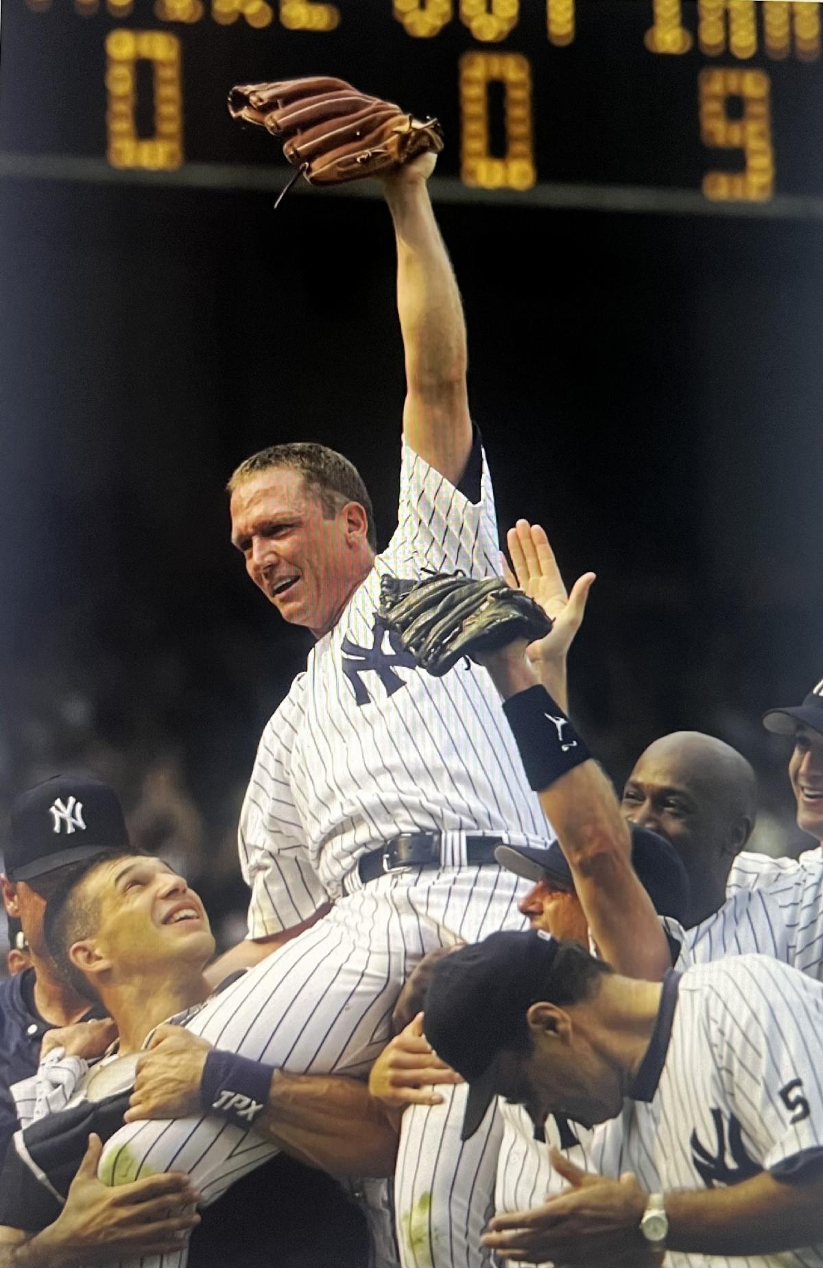 FILE - New York Yankees pitcher David Cone is lifted onto the shoulders of his teammates by catcher Joe Girardi, left, as manager Joe Torre joins in the celebration after Cone threw a perfect game against the Montreal Expos during “Yogi Berra Day” at New York’s Yankee Stadium, July 18, 1999. (AP Photo/Kathy Willens, File)