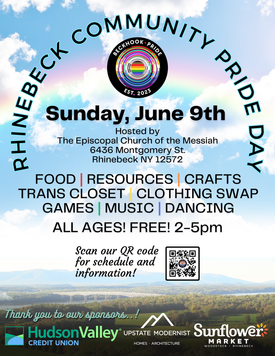Rhinebeck Community Pride Day, starting with a nonsectarian gathering of celebration and affirmation outside at 2PM, followed by music, crafts, clothing swap, Starr/Morton book bike, and more. At the Episcopal Church of the Messiah, 6436 Montgomery St. (Rte. 9), Rhinebeck.