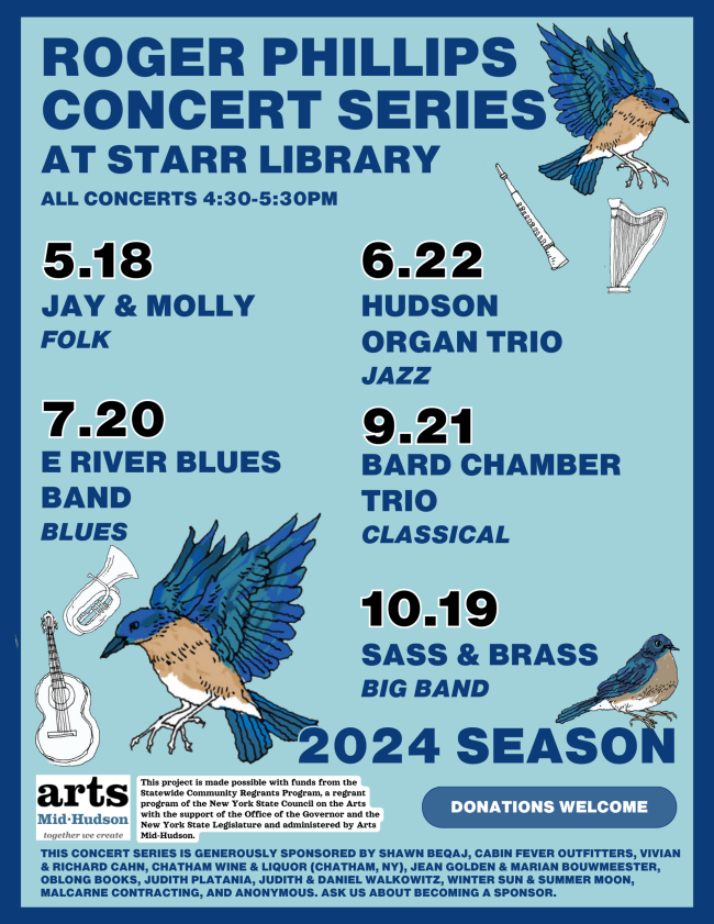 Hudson Organ Trio plays jazz. FREE. The second of four concerts in the Roger Phillips Concert Series. Sponsored by Arts Mid-Hudson. Bring a chair or blanket, but the concert will be indoors if the weather doesn’t cooperate. At Starr Library, 68 West Market St., Rhinebeck.