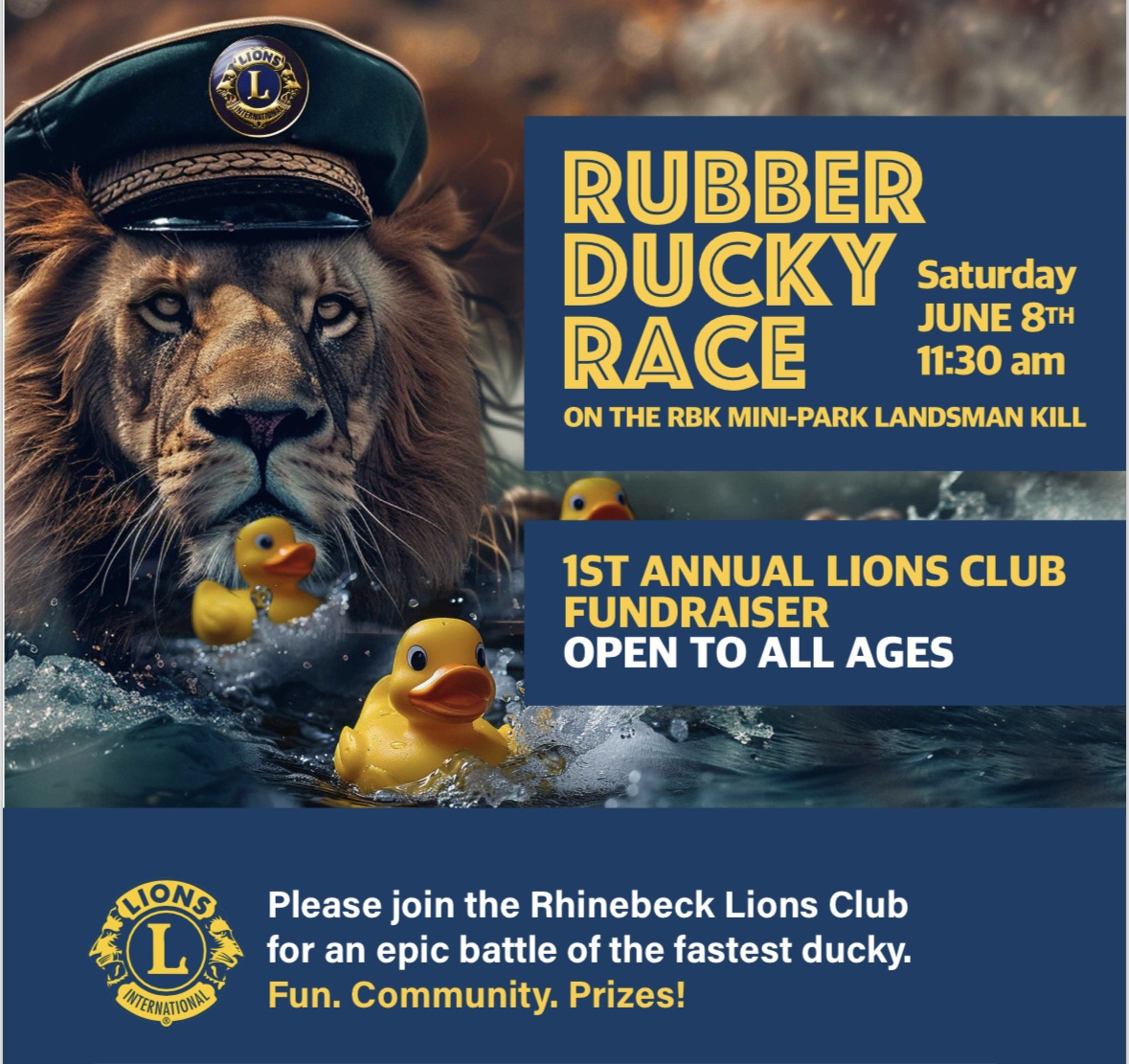 Rubber Ducky Race, Lions Club fundraiser. Open to all ages. One duck $5; 6 for $25; a flock of 25 $100. At the mini-park on South Parsonage, Rhinebeck.