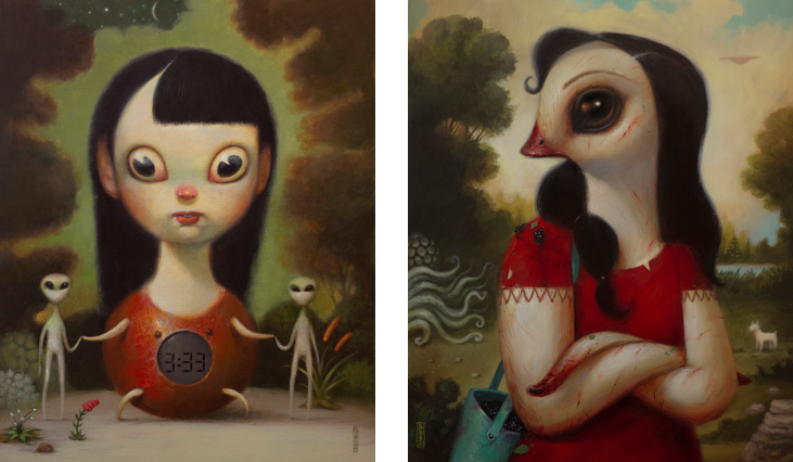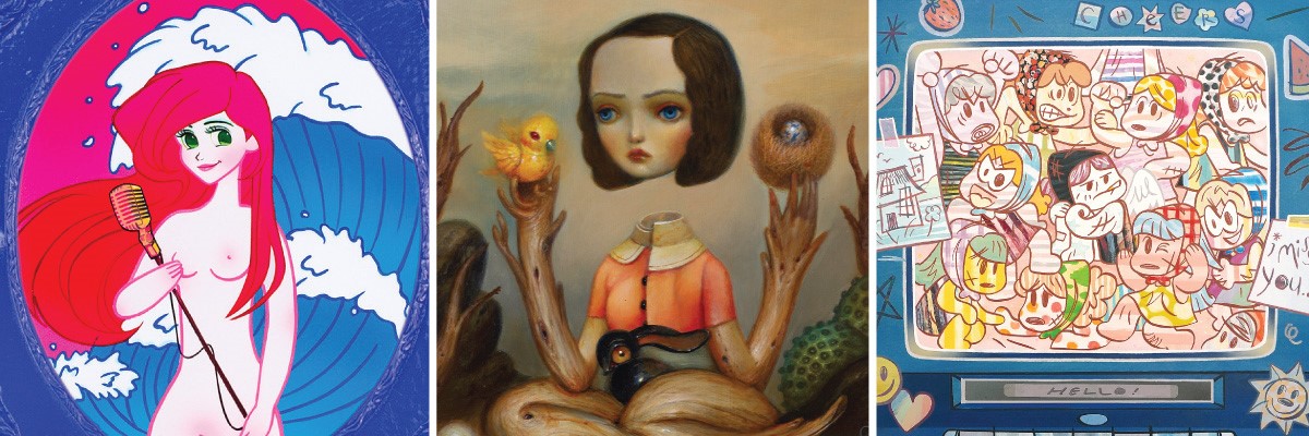 Contemporary faux naïf artist Sun-Mi (aka Pamplemouze) was born in Asunción, Paraguay and earned her BFA degree in Illustration at Maryland Institute College of Art in Baltimore. Her work is best known for her erratically naive girls who find themselves in never-ending conflict.