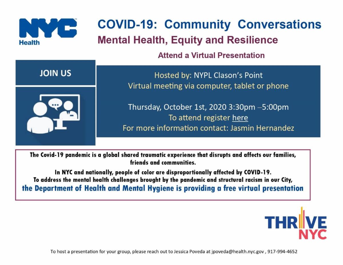 Join New York City Department of Health & Mental Hygiene at a virtual event titled: Community Conversations: Mental Health, Equity and Resilience.