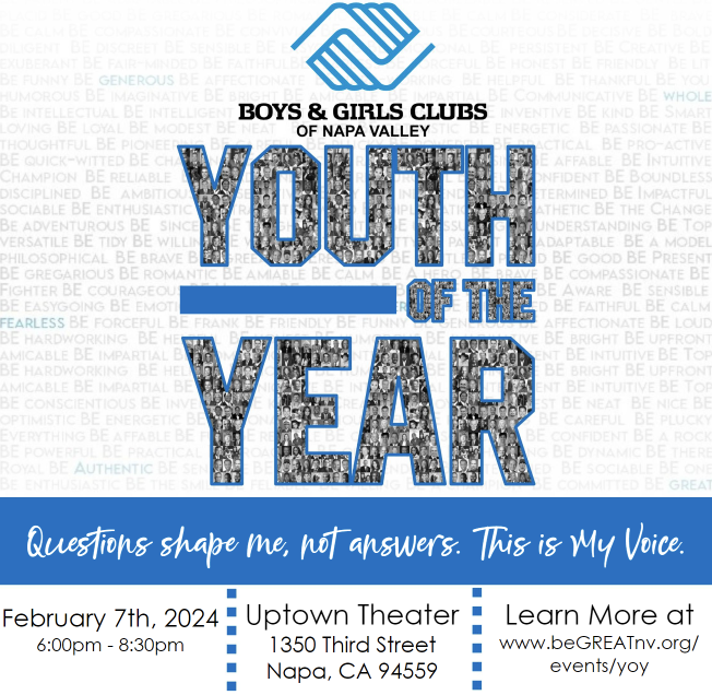 The Boys & Girls Clubs of Napa Valley and American Canyon support our youth to reach academic success and develop good character. During their annual Youth of the Year event, the Boys & Girls Club recognize the youth who stand out. In Napa and American Canyon, each nominee spends weeks preparing to tell their story on stage but there’s a whole lot more than storytelling behind the program. Finalists draft a series of essays on the topics of their Club experience, what matters to them most, and overcoming obstacles. On Wednesday February 7th, eight youth finalists from the Boys & Girls Clubs of Napa Valley will share their stories of bravery and hope to a packed audience at the Uptown Theater in downtown Napa. This is a free event and something you want to be a part of. Please reserve your seats HERE.