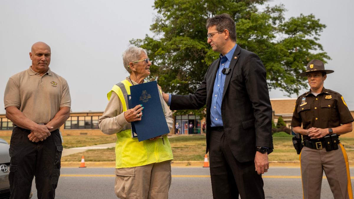 New Castle County Executive Matt Meyer paid a visit to county crossing guard Dee Nevares who celebrates her last day of work for the county today, after 51 years on the job. The County Executive presented Dee with a proclamation and challenge coin in recognition of her outstanding service to the community. To see video from the visit, CLICK HERE.