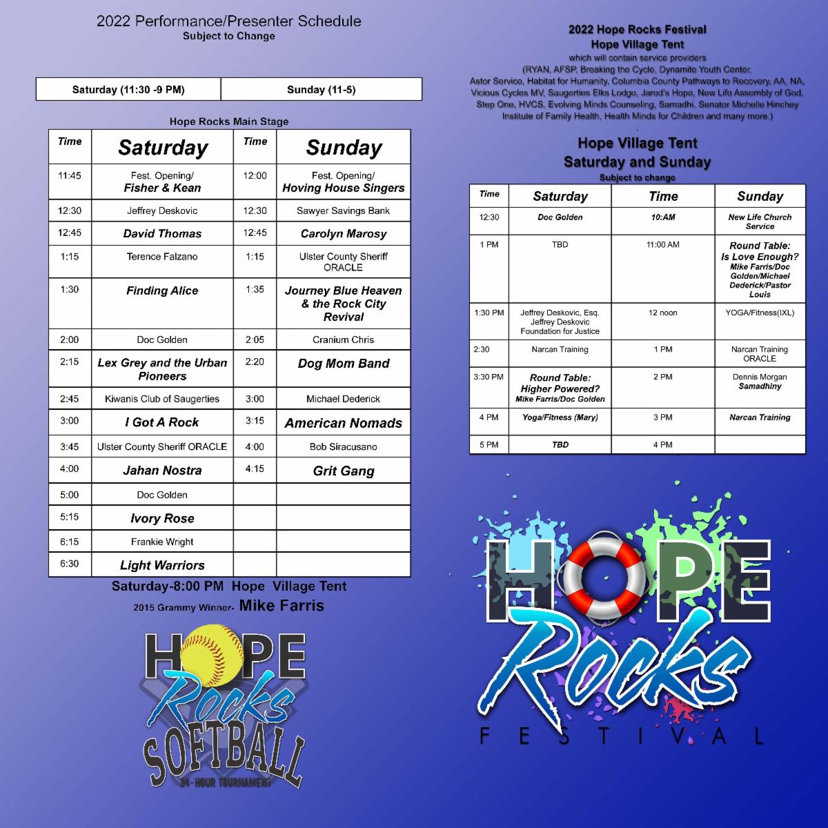 “This is our signature event. This is where the Hope Rocks mission to break down the stigma and shame associated with these issues and demonstrate the power of hope began. We are excited to have a great weekend of music, speakers, presentations, support and activities available to festival goers,” said Hope Rocks, Inc. president and founder Joe Defino. “This truly is a weekend to be lifted up and inspired.”