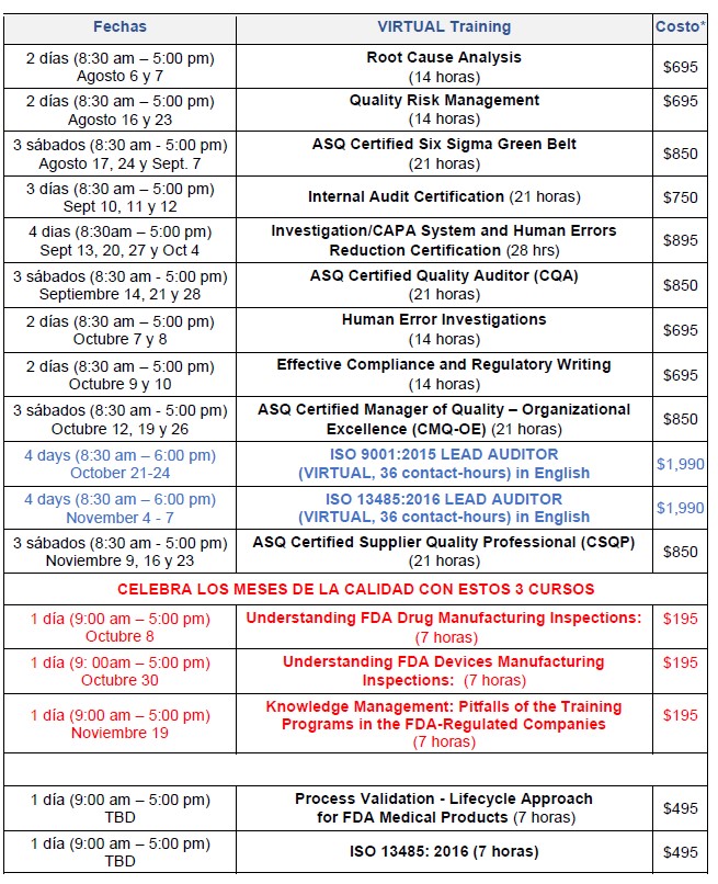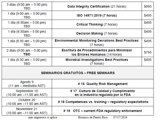 Además de estos estos cursos y academias tenemos disponibles mas de 80 cursos, academias y certificaciones enfocados en la industria regulada por la FDA. Todos ellos pueden ofrecerse de manera presencial o virtual a través de las plataformas de Teams, Zoom, etc.