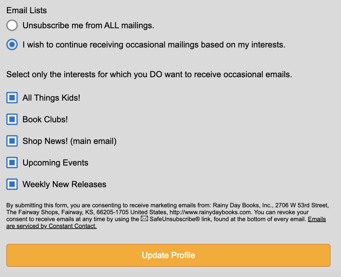 Your screen will now display a form of your information with this at the bottom. You can now unselect any newsletter feed you don't wish to receive. We highly recommend you stay subscribed to at least the "Shop News!" as this will be our way of communicating any changes, special events, or promotions you won't want to miss.