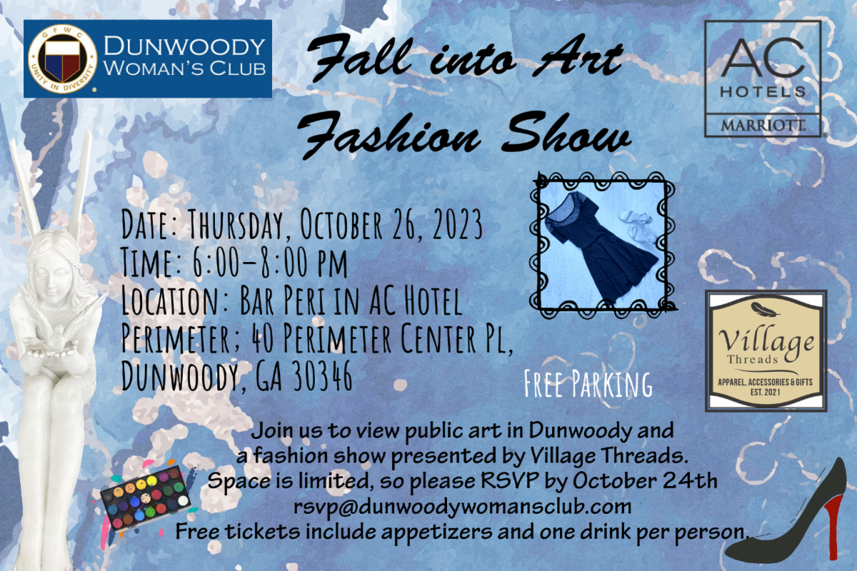 Join the Dunwoody Woman's Club Thursday, Oct. 26 from 6 – 8 p.m. at Dunwoody’s rooftop bar, Bar Peri, for a special Fall into Art Fashion Show.