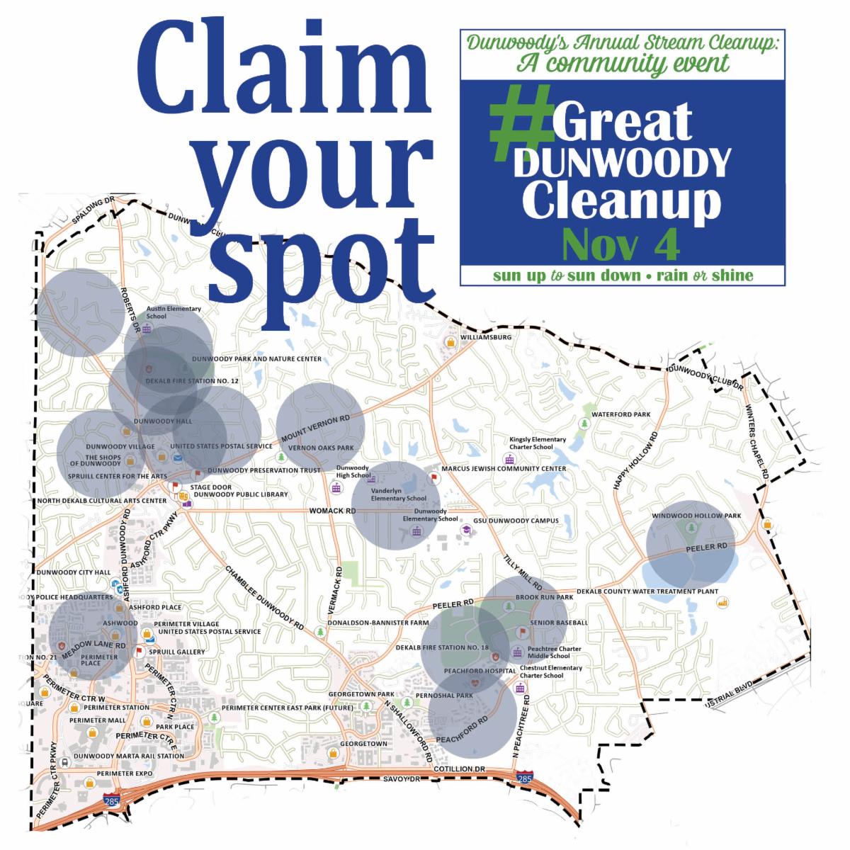 Volunteers should choose a spot in Dunwoody. It can be a street, a neighborhood common area, a stream or wooded area, and make a difference. Be sure to send photos or post them using the #GreatDunwoodyCleanup! Spots already claimed are mapped here.