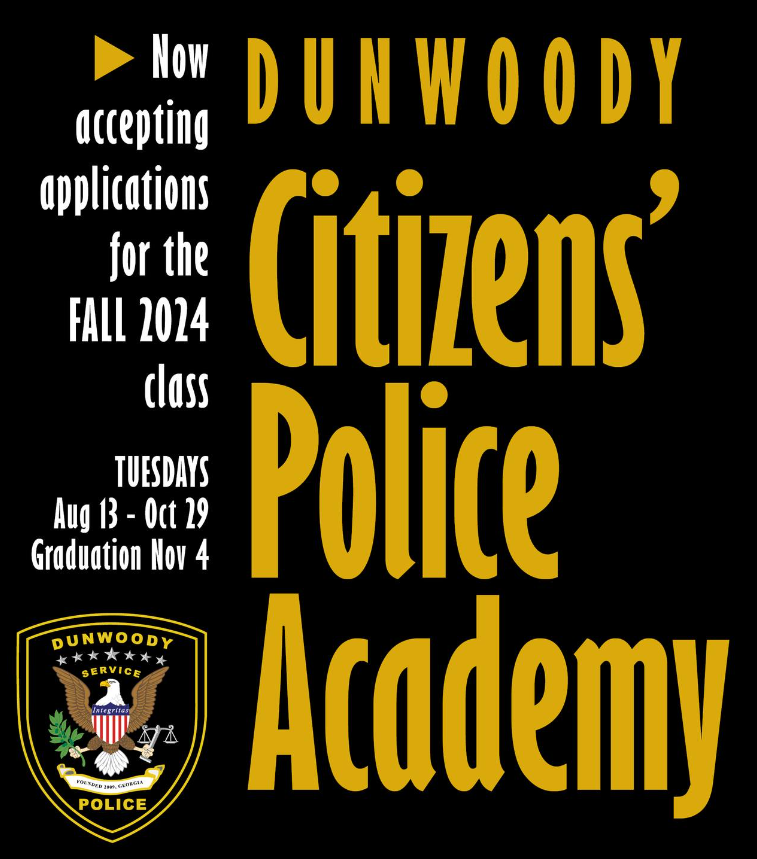The Dunwoody Citizens' Police Academy is a free, 12-week class that starts on Aug. 13 and runs through Oct. 29, meeting on Tuesday nights. DPD is now accepting individuals who live outside of Dunwoody. Here are some of the topics to be covered: