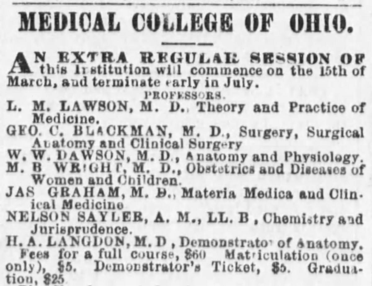 March 15, 1862: An “extra-regular session” of the Medical College of Ohio begins due to the great demand for U.S. Army physicians. The course of study, which is scheduled to end in July 1862, will include “special instruction ... given in reference to diseases of the camp and military surgery.” It is the first time that an extra session of the college is held.