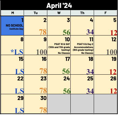 Please pay special attention to next week's schedule (below) which is impacted by the solar eclipse viewing and state-required PSAT/SAT testing. In terms of the cycle 100 day, this is an 8 period day that starts at 8:10 a.m. As for testing, sophomores and juniors test on Wednesday, while freshmen test on Thursday. There are no classes on Wednesday and Thursday due to testing. We do ask students to take these tests seriously as the results are another data point that help us to assess our practices and supports for all students.