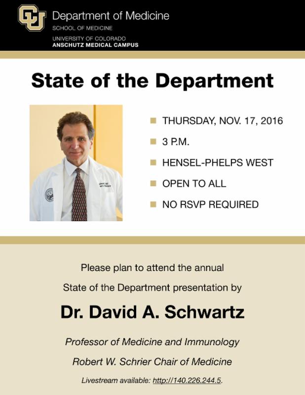 Endocrinology - Daniel Bessesen has been named interim director of the Anschutz Health and Wellness Center. Jane Reusch will become President-elect of the American Diabetes Association in January 2017. Robert Eckel has been appointed to the President’s Council on Fitness, Sports and Nutrition (3-year term).
