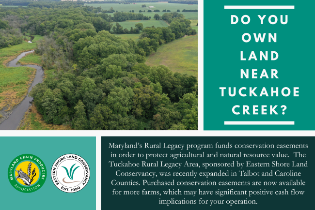 There are currently MD Rural Legacy opportunities for conservation easements located in the recently expanded Tuckahoe Rural Legacy area. This area stretches along Tuckahoe Creek in both Caroline and Talbot County. For more info contact David Satterfield at DSatterfield@eslc.org
