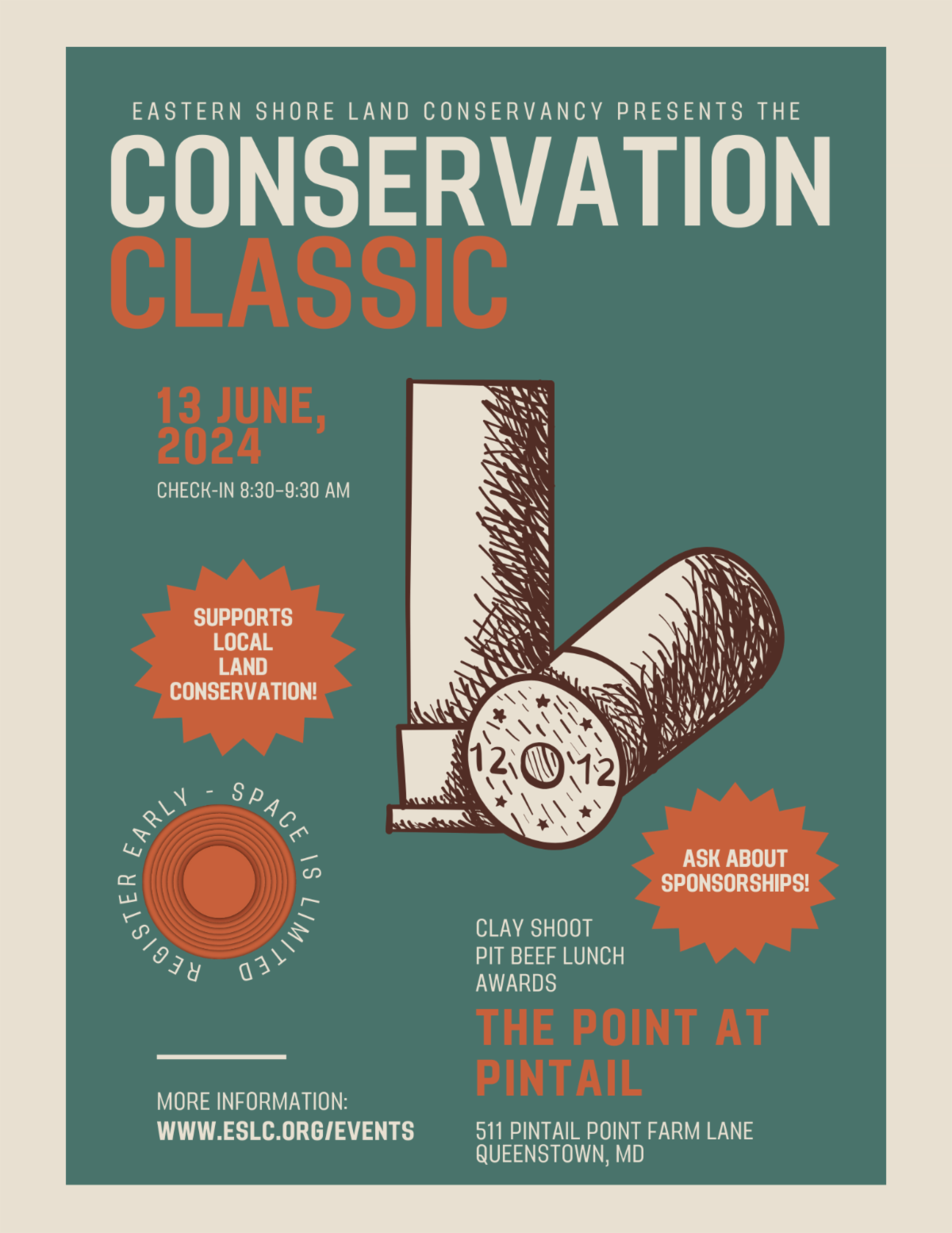 On Thursday, June 13, 2024, we will be hosting the second annual Conservation Classic, a sporting clays event at the Point at Pintail in Queenstown. This fun and competitive day will provide a morning of shooting followed by a pit beef lunch and awards. If target shooting and good food are your thing, please consider a sponsorship and bring your team of shooters along. We anticipate about 100 registrants for this event and non-shooters are welcome.