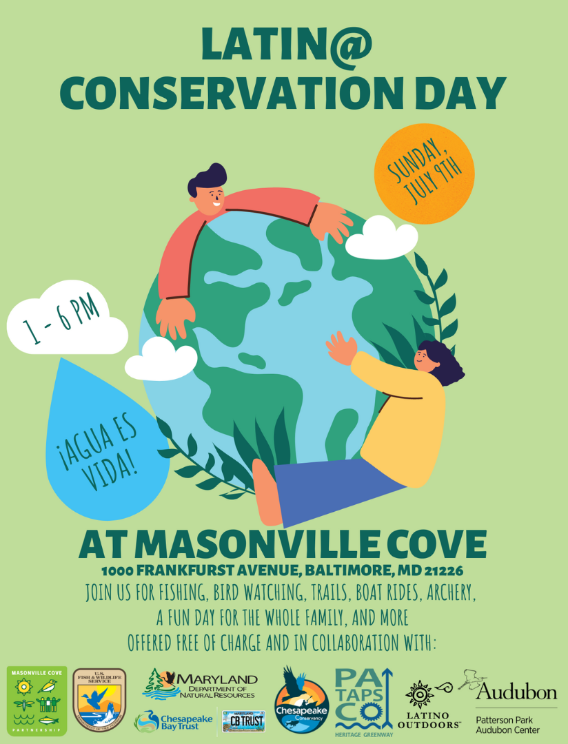 Come out to Masonville Cove Environmental Education Center (located in Baltimore, MD) for Latino Conservation Day! The celebration will be taking place July 9th, 2023 1:00-6:00pm. Fishing, birdwatching, trails, boat rides, archery and more will be available to the public free of charge.