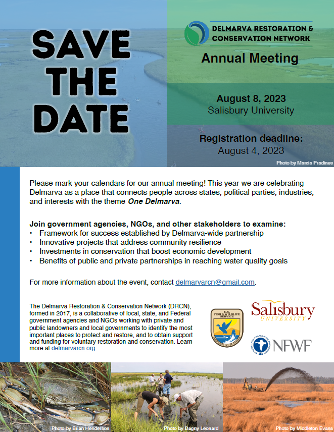 The Delmarva Restoration and Conservation Network (DRCN), formed in 2017, is a collaborative of local, state, and Federal government agencies and NGOs working with private and public landowners and local governments to identify the most important places to protect and restore, and to obtain support and funding for voluntary restoration and conservation.