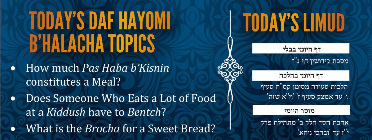 If a person eats a large quantity of pas haba b’kisnin, he is obligated to wash his hands, recite Hamotzi and bentch. The Achronim disagree on the definition of a large amount. Some say that it is a standard amount, equivalent to either three or four eggs. Others say that there is no exact amount; instead, it is relative to the quantity that the people in the region eat for their morning or evening meal. Although the primary halacha follows the second opinion, it is best to be stringent and avoid eating four eggs’ worth of pas haba b’kisnin. Some Achronim hold that it is only necessary to be stringent when the food contains four eggs’ worth of flour (not including the other ingredients). Others say that one should be stringent under all circumstances.