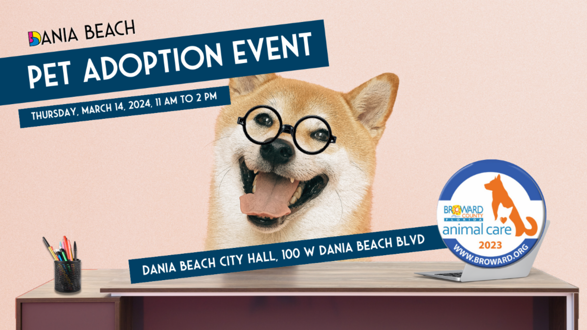 As part of the Take Our Dogs to Work Day, Dania Beach is hosting a pet adoption event with the Broward County Animal Care on Thursday, March 14, 2024, from 11 a.m. to 2 p.m. at Dania Beach City Hall, 100 W Dania Beach Blvd.