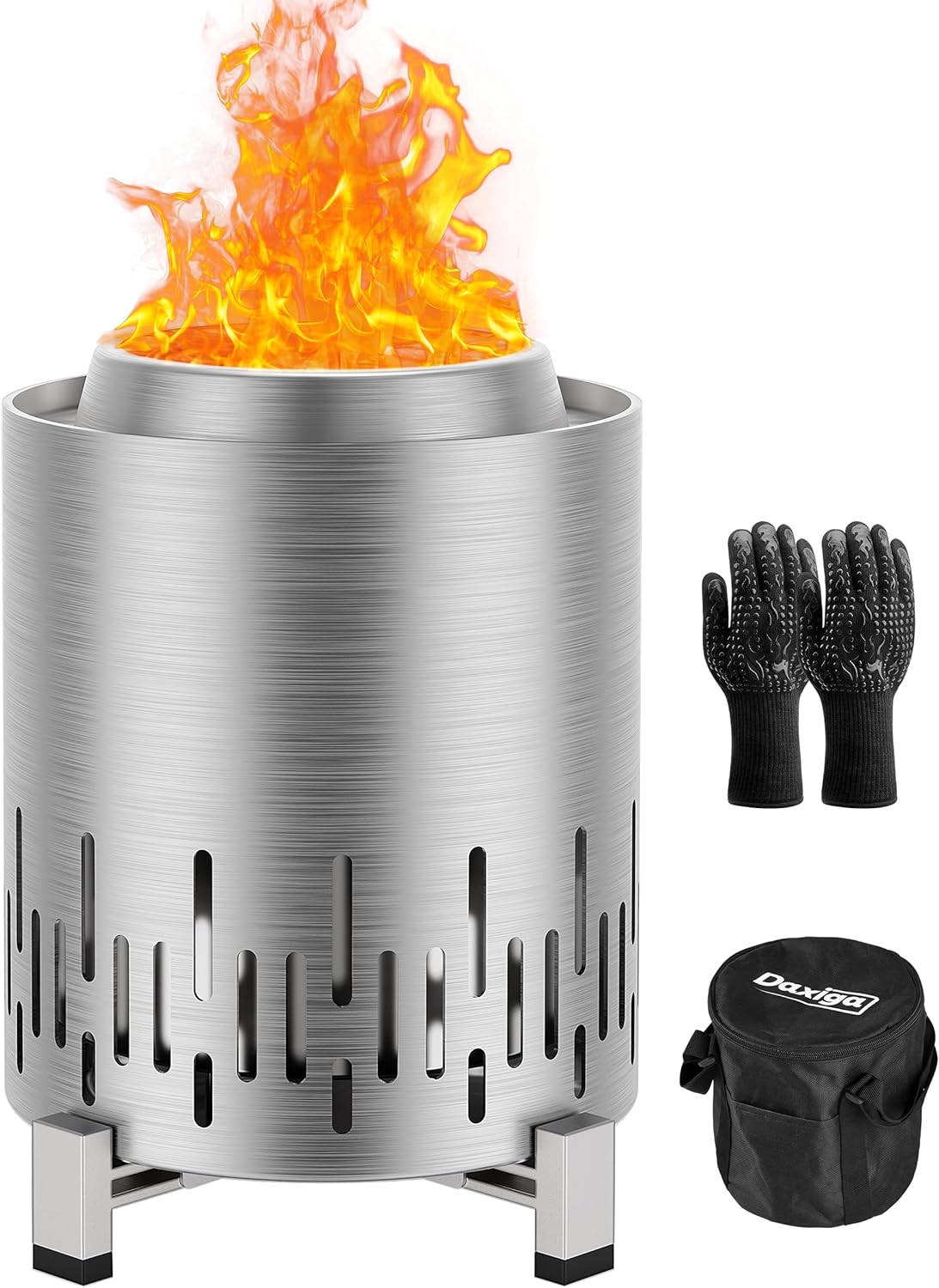 Daxiga Tabletop Fire Pit with Stand, Low Smoke Mini Fire Pit for Backyard & Urban Indoor Fire Pit Fueled by Pellets or Wood, Full Body Made of Stainless Steel, Heat-Resistant Gloves, Travel Bag Included