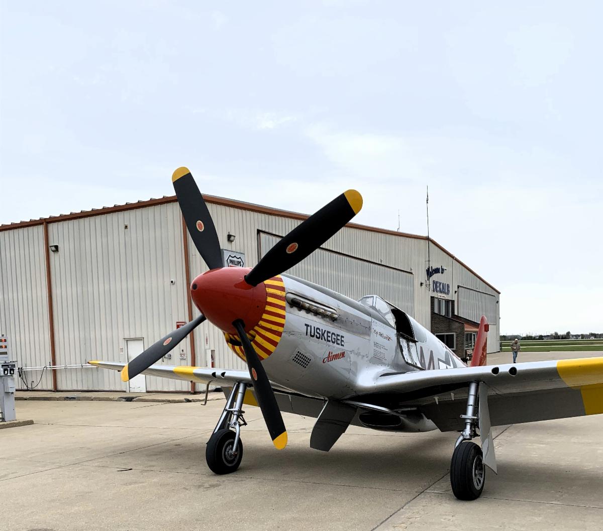 This P-51C Mustang was a training aircraft during World War II. During a subsequent restoration, it was given the signature red tail of the aircrafts flown by the Tuskegee Airmen. It now serves as a museum without walls, telling the story of the first African American military aviators in the US Armed Forces. After its brief stop in DeKalb, the plane went on to St. Paul.