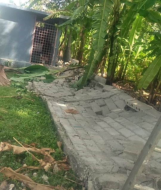 The perimeter wall at Maison de Naissance collapsed, taking down the power lines from our generator building. Fortunately, the solar power system appears to be intact. The foundation of the main building is badly damaged, as shown on the left, and the interior cannot be assessed due the to danger of collapse. This will be the first time in history our center will be closed, until the damage is assessed and it is determined whether the building is safe.