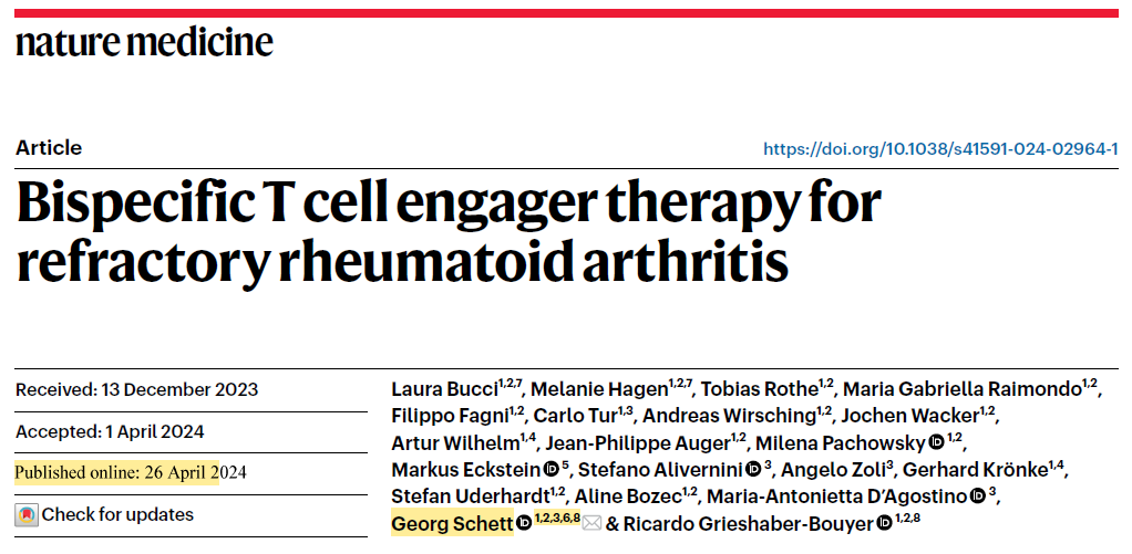 Amazingly Prof Georg Schett was also the first one to publish, on April 26, 2024, again in Nature Medicine, “Bispecific T cell engager therapy for refractory rheumatoid arthritis”. This publication reported 6 rheumatoid arthritis (RA) patients treated with Blincyto, a CD19xCD3 bispecific antibody, with impressive outcome. Notably, the dosing and administration is modified but still in an inpatient setting as continuous intravenous infusion: 9 μg/day for 5 days, followed by a second cycle 9 days later (each cycle is 2 wks with 5 days on and 9 days off).