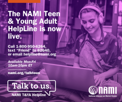 NAMI is proud to introduce the Teen & Young Adult (T&YA) HelpLine: A free nationwide peer-support service providing information, resource referrals, and support to teens and young adults. Our T&YA Specialists are young people who understand what you're going through because they have been through stuff, too. They are experienced and well-trained. They care and want to help you find a way forward. Reach out by phone, text, or chat.