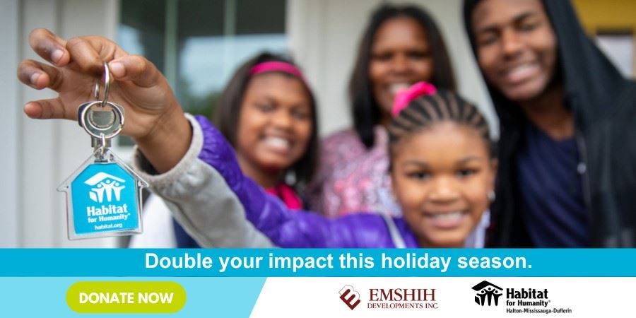 This year you can increase your support of Habitat for Humanity Halton-Mississauga-Dufferin thanks to a generous gift from Emshih Developments who will match every donation up to $20,000. This means that your contribution will have twice the impact, allowing us to reach even more families in need.
