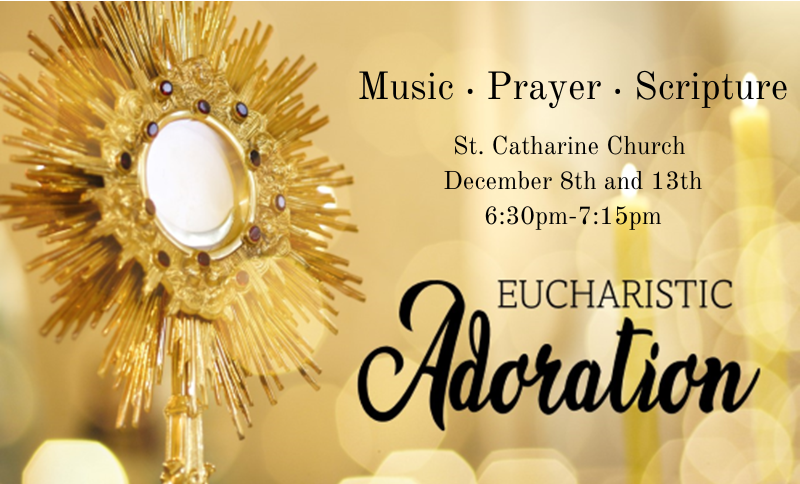 Please join us for Eucharistic Adoration of our Lord in the Blessed Sacrament on December 8th and 13th. We will pray together, enjoy beautiful Eucharistic hymns, and hear Scripture readings related to the Eucharist. | |