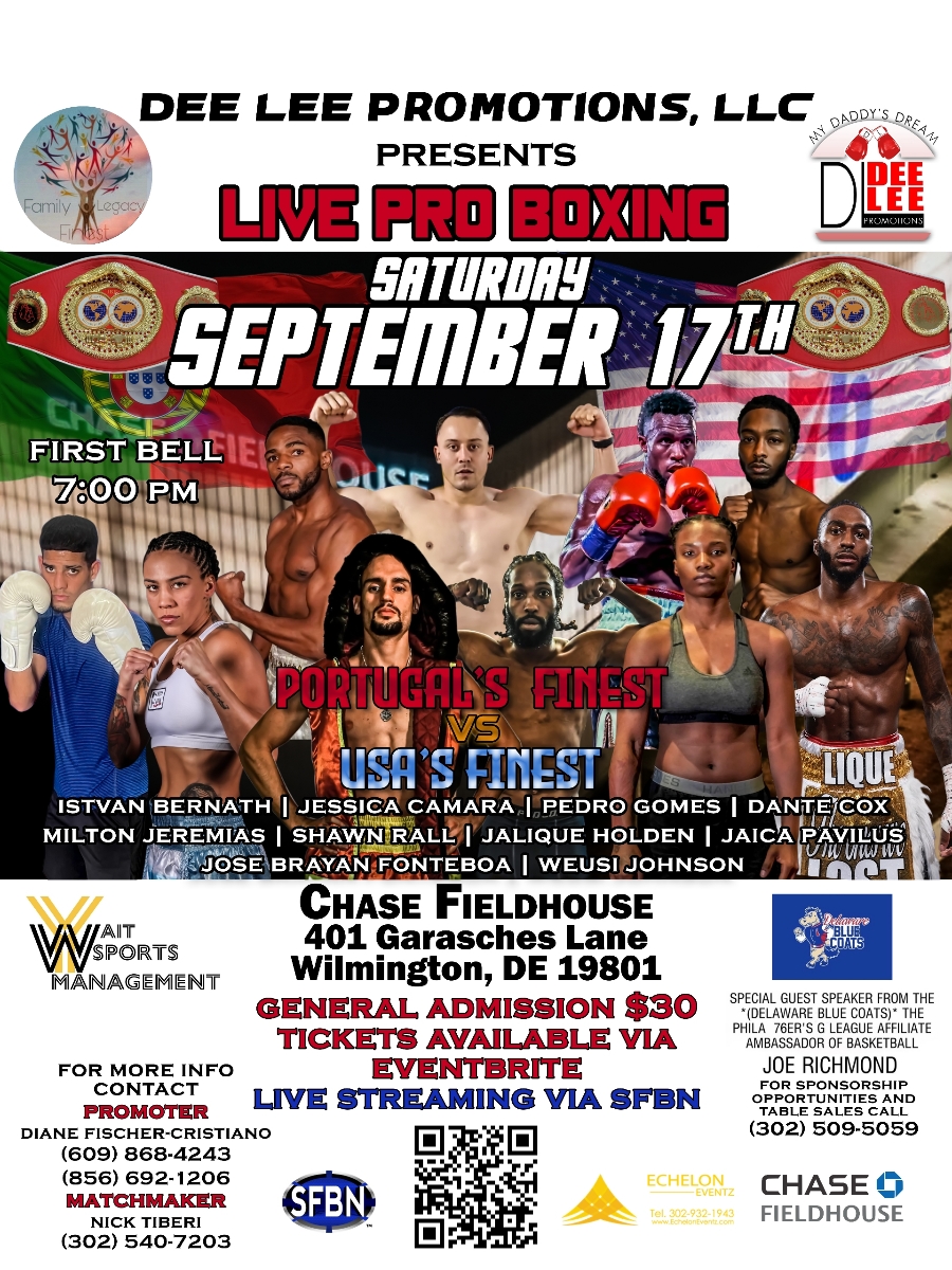 Wilmington, DE- Dee Lee Promotions, LLC in association with Family Legacy Finest and Matchmaker, Nick Tiberi will present a night of LIVE INTERNATIONAL PROFESSIONAL BOXING on Saturday, September 17, 2022 at The Chase Fieldhouse, 401 Garasches Lane, Wilmington, DE 19801. This sensational fight card features many of boxing's young up and coming international talent on the hunt to make their mark in the world of professional boxing. Fighters from Portugal, Hungary and Canada have big dreams and each believes Wilmington will be a big step in accomplishing those dreams.