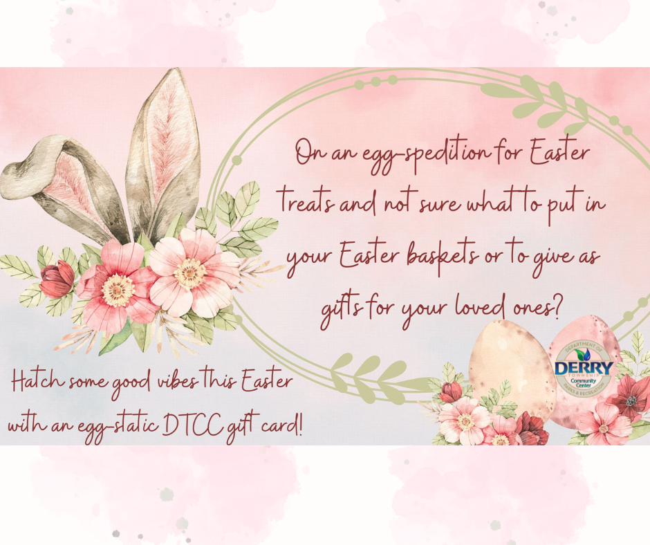 Are you embarking on an eggs expedition for Easter treats but unsure what to fill your baskets with or what gifts to give your loved ones? Bring joy this Easter with an eggstatic Derry Township Community Center gift card! It can be used towards membership or any fun-filled program they've been waiting to try! Click to purchase! | |