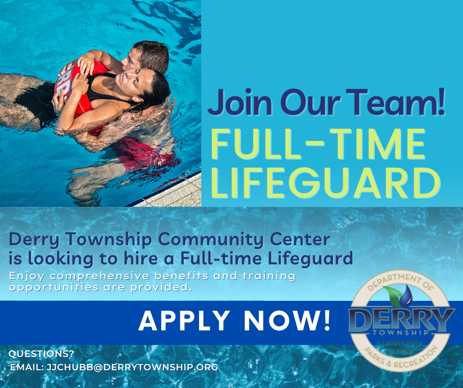 Hiring Full-Time Lifeguard | Join our team at the Derry Township Community Center. We’re looking to hire a Full-time Lifeguard. Comprehensive benefits and training opportunities are provided. Questions? Email Joseph Chubb. Apply Now! | | |