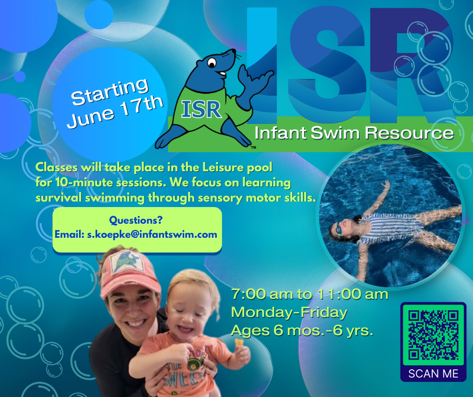 Infant Swim Resource-ISR Classes | Ready to equip your child with life-saving swimming skills? Enroll in Infant Swim Resource-ISR classes at the Leisure Pool! Classes run for 10-minute sessions in a 6-week interval period, 5 days a week, Monday through Friday. These classes are for children 6 months to 6 years old and focus on learning survival swimming through sensory motor skills. For inquiries about the program or instructor Stefanie Koepke, click the link! | | |