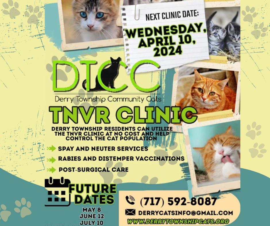 Derry Township Community Cats will offer residents a free TNVR (Trap-Neuter-Vaccinate-Return) clinic on Wednesday, April 10, 2024. This clinic is designed to help control the cat population in the area. Derry Township Community Cats will offer future clinics on May 8 and June 12. If you have any questions about the clinics or the TNVR program, please don't hesitate to contact them by phone at 717-592-8087, by email, or through their website. We hope to see you at the clinic!