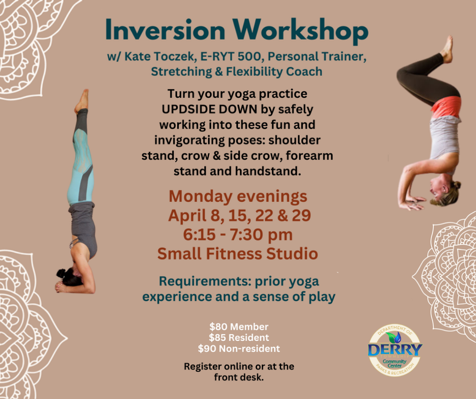 Inversion Workshop, with Kate Toczek, E-RYT, Personal Trainer, Stretching, and Flexibility Coach. This workshop turns yoga practice upside down by safely working into these fun and invigorating poses: shoulder stand, crow and side crow, forearm stand, and handstand. Follow the link for class details and registration!