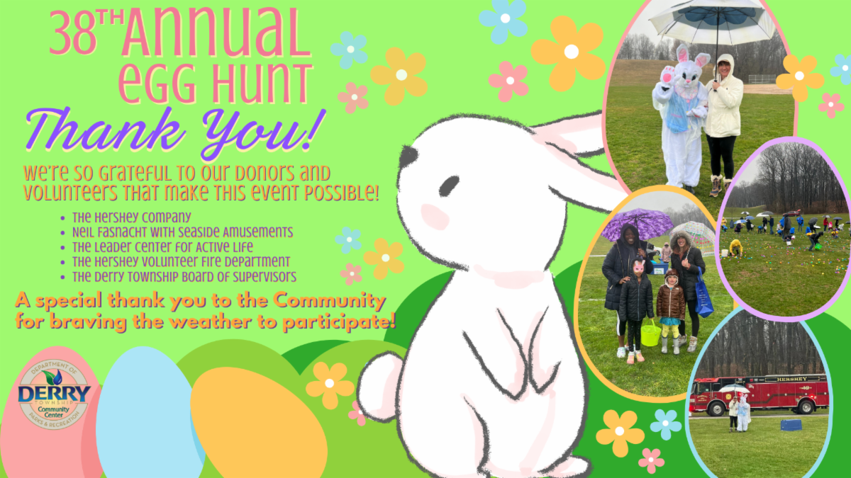 The rain did not stop the 38th Annual Derry Township Parks & Recreation Easter Egg Hunt at Shank Park this past Saturday morning! We are so grateful to our donors and volunteers who make this event possible annually. Thank you to The Hershey Company, Neil Fasnacht with Seaside Amusements, The Leader Center for Active Life, The Hershey Volunteer Fire Department, and the Derry Township Board of Supervisors! A special thank you to the Community for braving the weather to participate! | | |