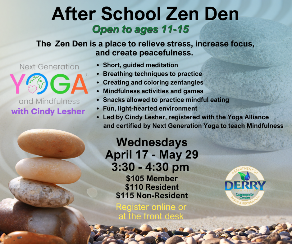 After School Zen Den, Next Generation Yoga® with Cindy Lesher will help kids ages 11-15 to slow down and discover peacefulness by practicing mindfulness in a lighthearted environment. Enroll today!