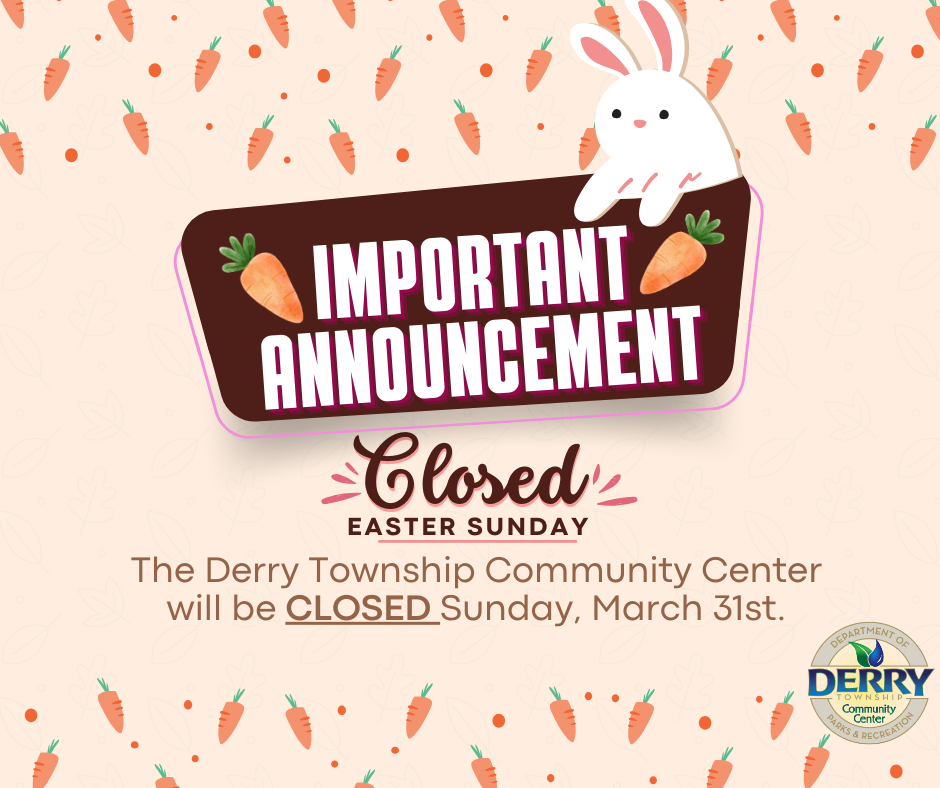 Derry Township Community Center Closed | The Derry Township Community Center will be closed on Sunday, March 31, 2024, due to the observation of the Easter holiday. | | |