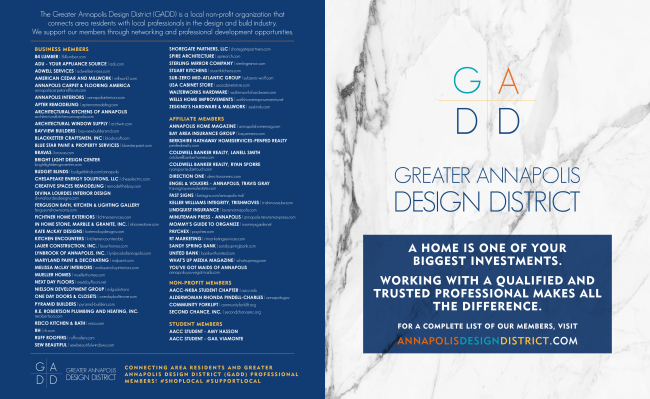 Proud Member and serving as President for the Greater Annapolis Design District (GADD).
