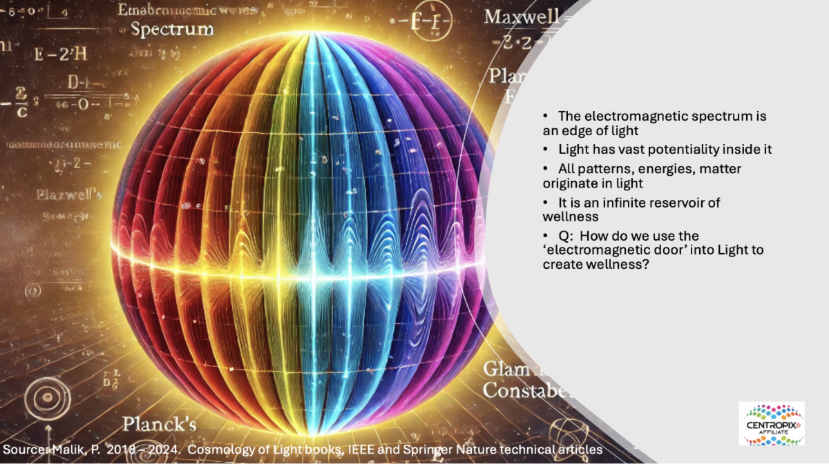 Specifically, I gave a presentation on a Pulsed Electro Magnetic Frequency (PEMF) Device - PEMF Kloud Signal: A Pathway to Longevity, in which I highlighted that the electromagnetic spectrum is only an edge of Light, and further, can become a doorway into more of the the fullness of Light. It is an edge because its fourfold architecture can be modeled to originate from four properties implicit in Light. It can become an active doorway by learning to appropriately leverage known mechanics associated with it - signal shape, repetition rate of the signal, frequency range embedded in the signal, and penetration depth due to micro-Tesla power range that may animate it.